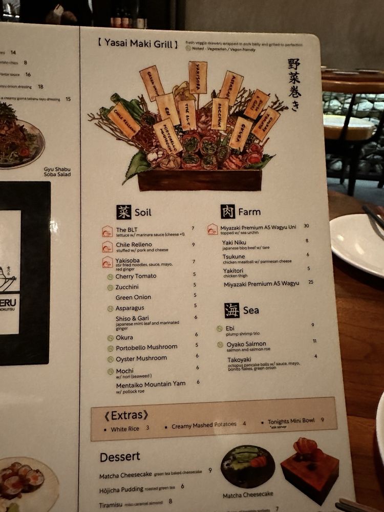 Fresh veggie skewers wrapped in pork belly and grilled to perfection all sticks come with 2 signature dipping sauces and taberu rayu wrapped in seaweed (nori).